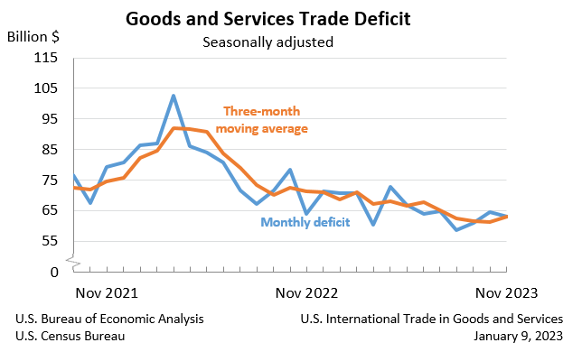 International Trade: The U.S. monthly international trade deficit decreased in November 2023, with the deficit narrowing from $64.5 billion in October to $63.2 billion in November, as imports decreased more than exports. (BEA)
